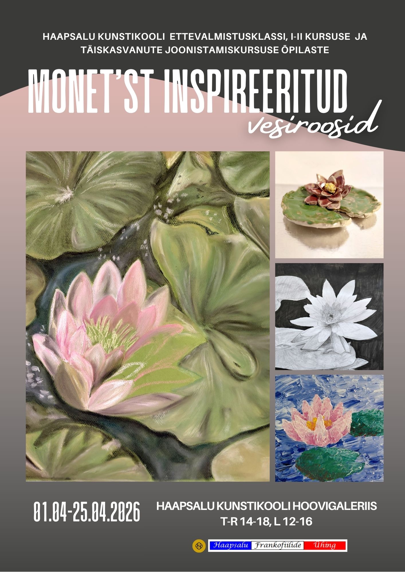Näitus “Monet´st inspireeritud vesiroosid” on järjekorras kolmas , mis valminud Haapsalu Kunstikooli ja MTÜ Haapsalu Frankofiilide Ühingu koostöös: