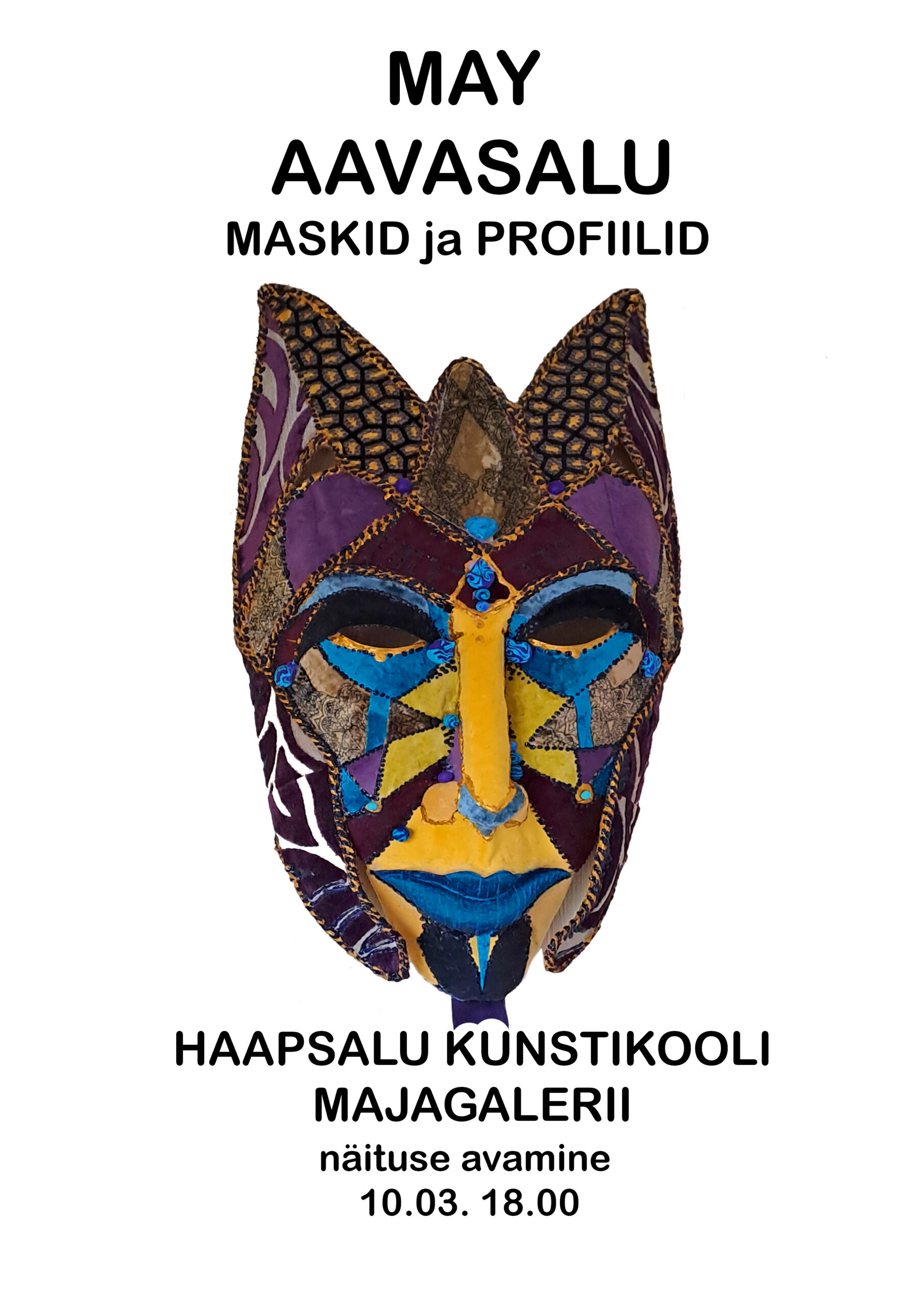 Haapsalu Kunstikooli majagaleriis 10.-28.03.2026 avatud näitusega “Maskid ja profiilid” tähistab kunstiõpetaja ja kunstnik MAY AAVASALU oma 75. sünnipäeva.